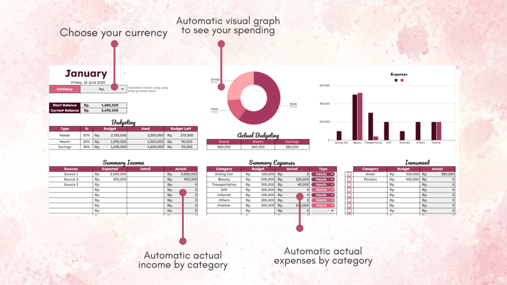 Start being intentional with your money and jumpstart your personal finance journey with this Monthly 50/30/20 Budget spreadsheet. Uses the highly recommended 50/30/20 budgeting method, which allows you to allocate your income towards Needs (50%), Wants (30%), and Savings & Debt (20%). Includes only the things you need and is made to be simple, easy to understand, yet visually appealing. All you have to do is input your transactions and everything else is calculated automatically!